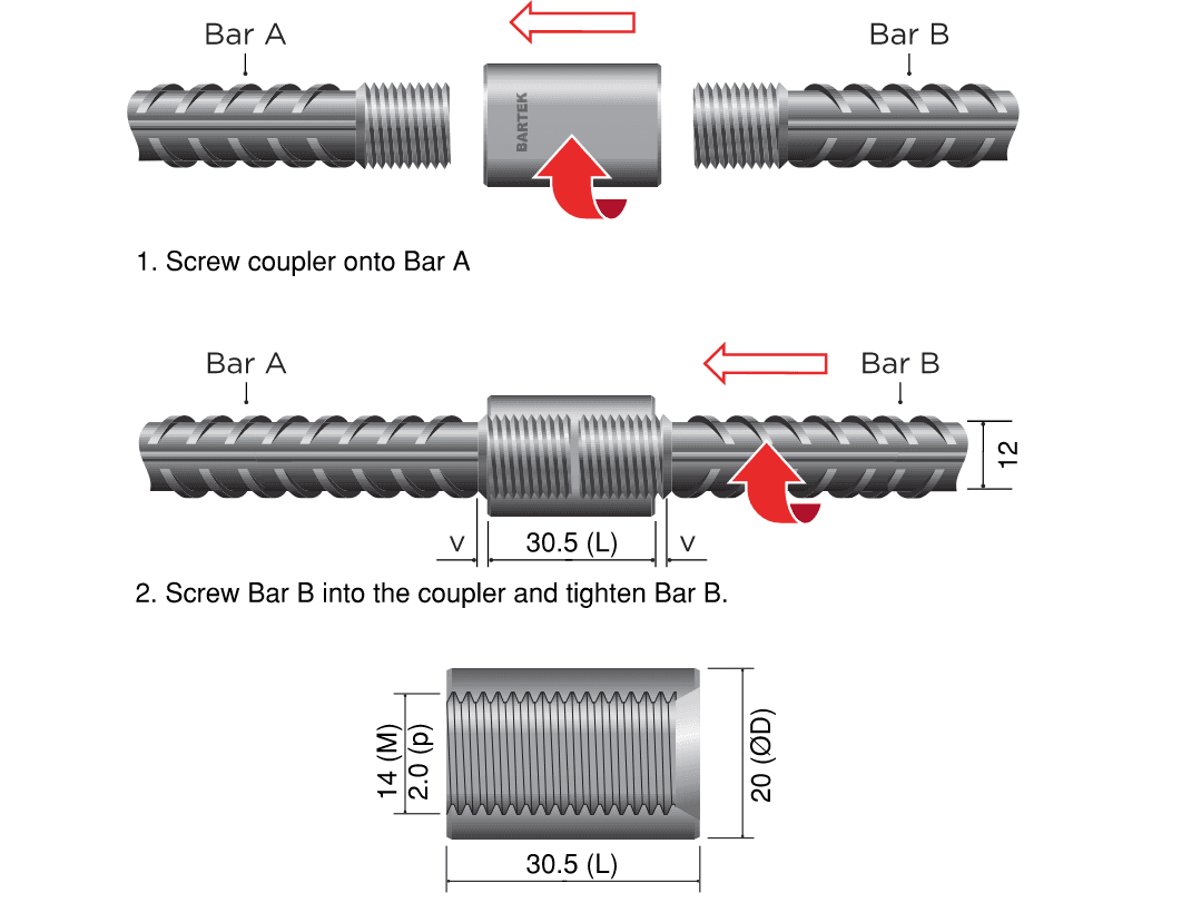 The Bartel PTM Rebar Splice System is a parallel threaded mechanical splicing system for the connection of reinforcing bars from 12 to 40mm, it is designed and manufactured to meet or exceed the requirements of major international standards such as: AS 3600, AS5100, ISO 15835, Eurocode 2, BS 8110, DIN 1045, ACI 318, IBC, AASHTO, ASME Sec III Div 2.